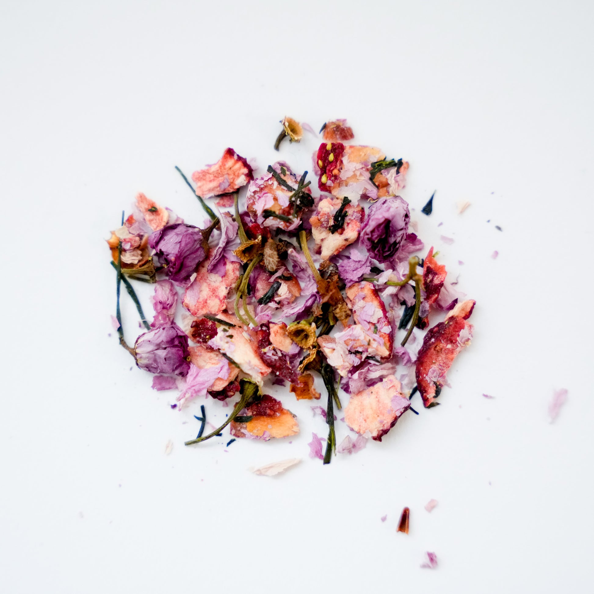 double-flowered cherry blossoms, green tea, and dried strawberry blend